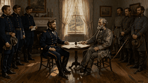 On April 9, 1865, General Robert E. Lee rode to the McLean House in the village of Appomattox Court House, Virginia, and surrendered the Army of Northern Virginia to General Ulysses S. Grant, effectively ending the American Civil War. Lee arrived in his finest dress uniform, with a jeweled sword at his side; Grant arrived in a mud-spattered private's coat with his rank pinned to the shoulder. The contrast was not incidental — it captured something true about the two men and the two visions of America they represented. Their meeting lasted approximately ninety minutes. Grant's terms were generous to a degree that surprised observers: Confederate officers could keep their sidearms, soldiers could keep their horses and mules for the spring planting, and no man would be prosecuted for treason as long as he kept his parole. "The war is over," Grant reportedly told his staff when they began to cheer. "The rebels are our countrymen again."